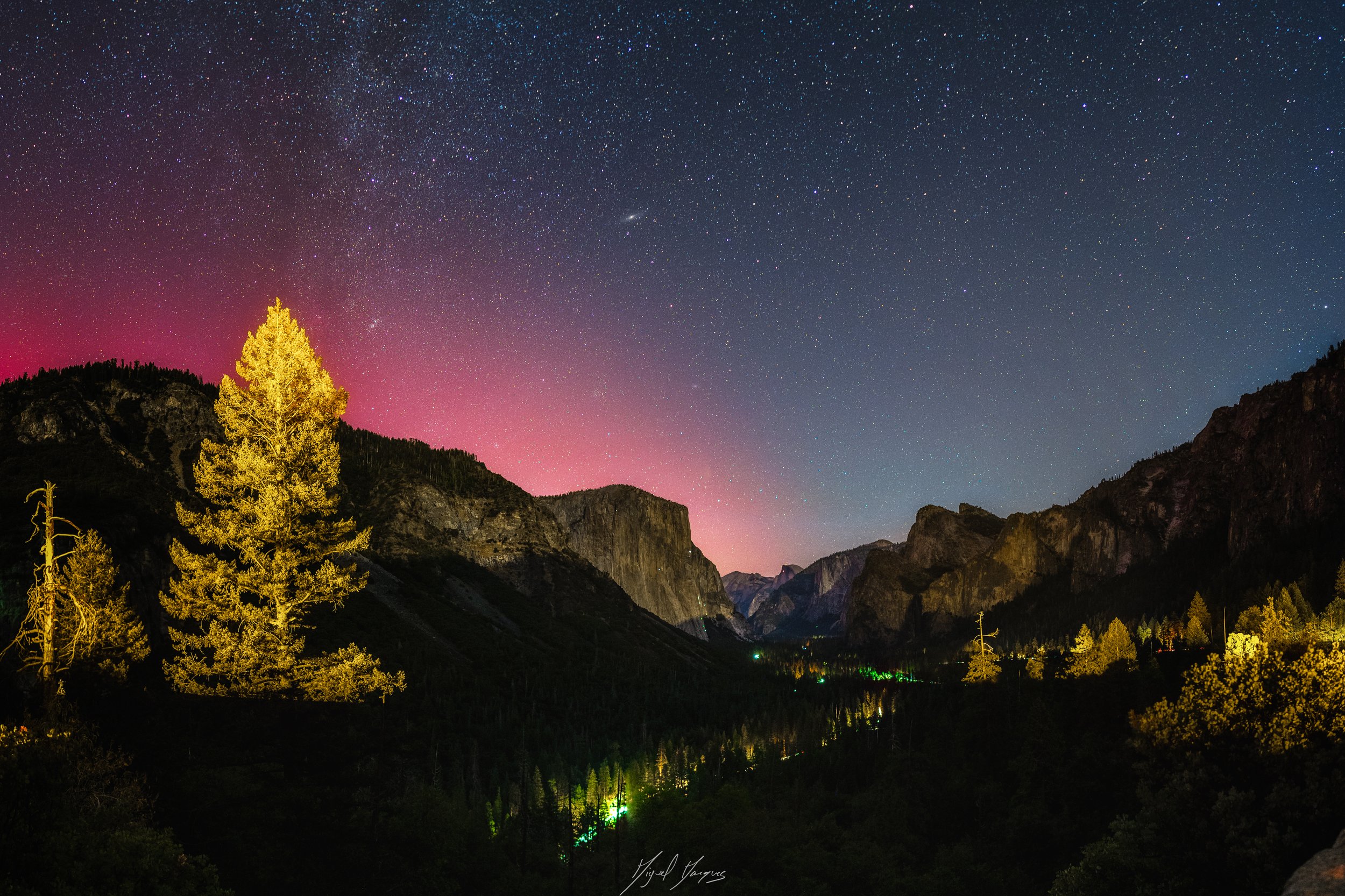 Fizemos mais uns quilómetros, até chegar ao Sequoia National Park e deixámo-nos encantar pela quantidade de árvores gigantescas que ali se encontram. Mais um quilómetros e fomos até ao Ancient Bristlecone Pine Forest, onde se patenteia, a árvore mais antiga do mundo e ficamos, mais uma vez, rendidos àquelas deslumbrantes paisagens. Trilhámos e descobrimos diferentes composições para fotografarmos à noite, mas o tempo pregou-nos uma partida, por isso decidimos ir até ao Mono lake, para fotografar durante a noite. Qual não é o nosso espanto quando percebemos que não fomos os únicos. É realmente um sítio incrível e com diferentes enquadramentos, mas o frio que se fez sentir naquela noite enregelou-nos e só queríamos aquecer. Naquela zona não havia nada aberto antes das sete da manhã, por isso, imaginem como longa pareceu aquela noite … Tivemos de esperar até que um café ali perto abrisse e lá fomos nós tentar aquecer. Chegámos ao céu! O ambiente era quente e confortável e a comida era um verdadeiro regalo. E muita! Tanta que só à tarde é que tivemos fomos. fome! Foi, sem dúvida, um momento inesquecível. Nesse dia visitamos o Yosemite National Park durante, o dia e deixámo-nos ficar até à noite, onde conseguimos fotografar uma aurora boreal, numa das vistas mais impressionantes do parque.